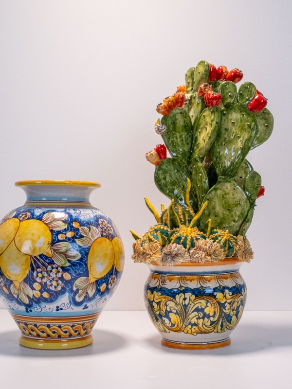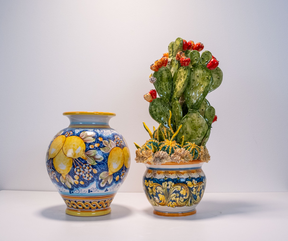 I vasi e sottovasi in ceramica di Caltagirone sono creazioni artigianali ricche di colore e tradizione.